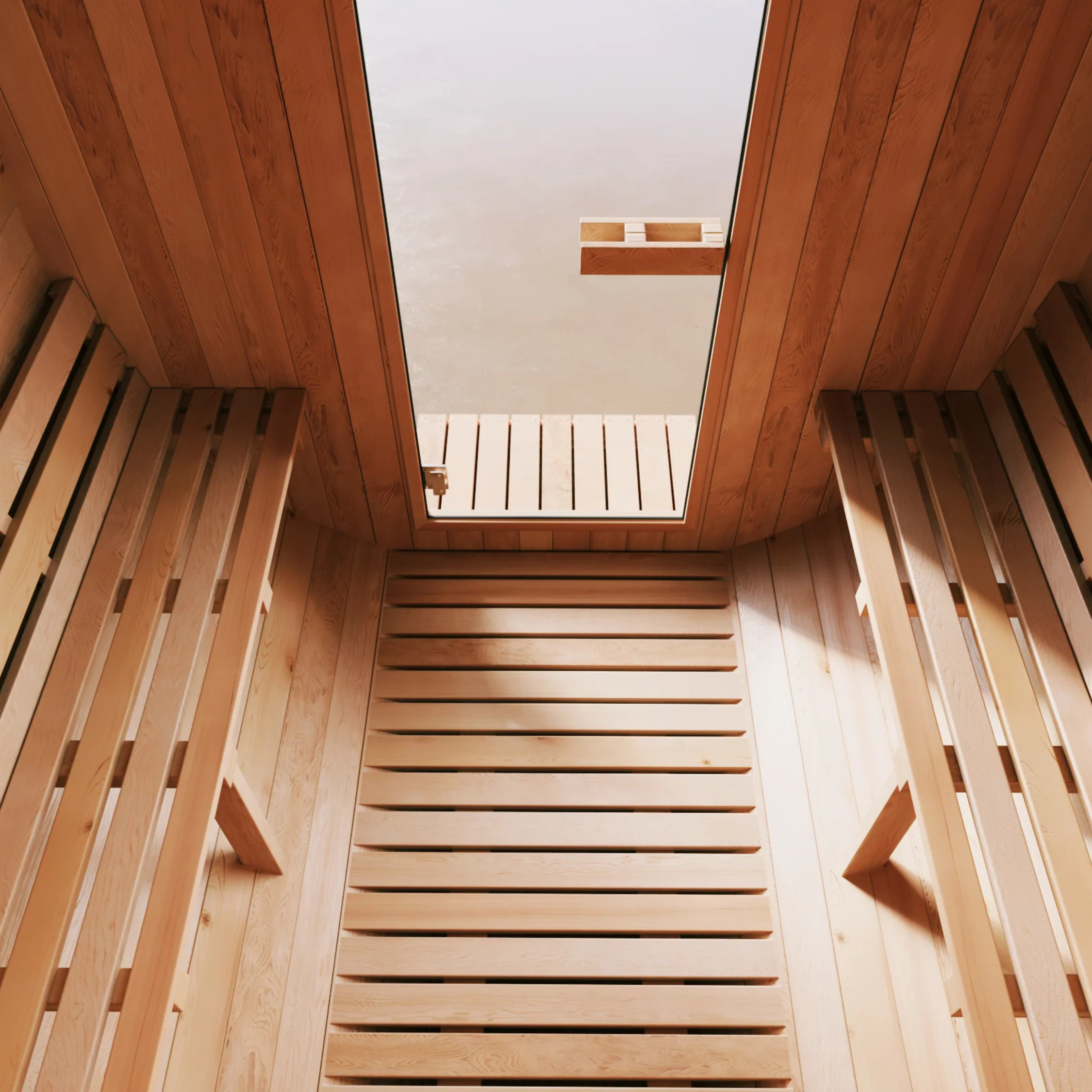 Authentic heat contained within sustainably sourced cedar or hemlock, framed by clean glass panels for a timeless finish.